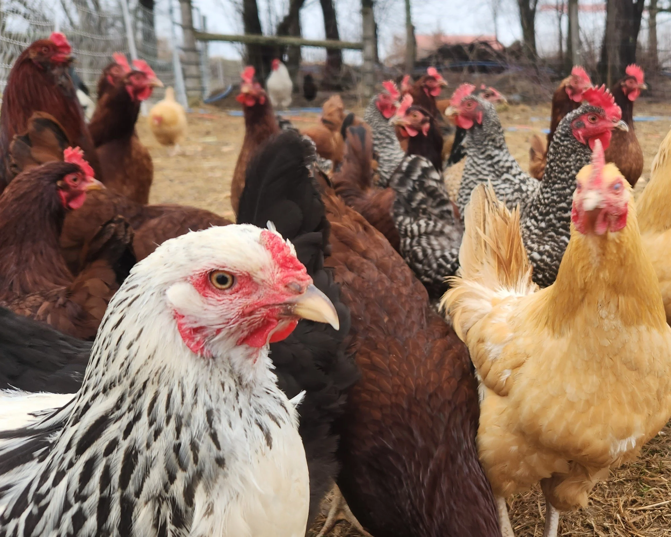 Birds are day range on pasture and fed organic feed. They are a happy random mix of Rhode Island Reds, Barred Rock, Ameraucana, Silver-Laced Wyandotts, Australorps, Buff & Blue Orpingtons, Leghorns and Araucana Bantams plus mixed breeds based on the Enfield Elementary 3rd grade breeding project.